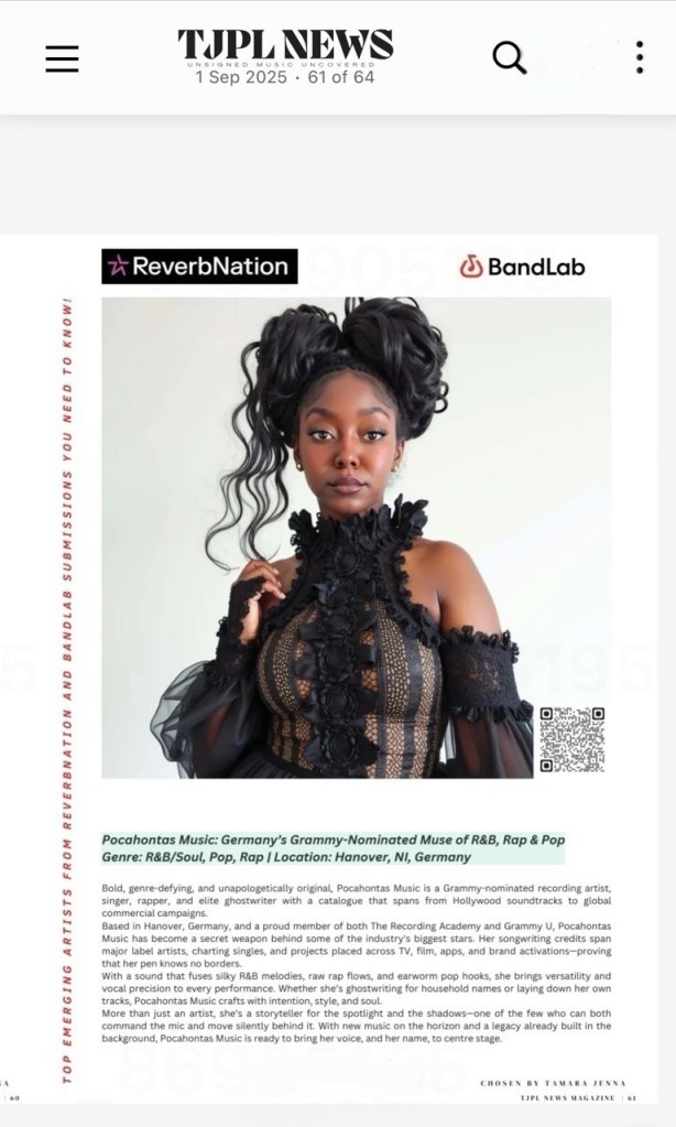 The TJPL News feature introduces Pocahontas as “Germany’s Grammy-Nominated Muse of R&B, Rap & Pop.” It emphasizes her cross-genre talent and highlights her dual identity as both a celebrated ghostwriter and a performing artist. For readers, it paints a vivid picture of an artist who is equally comfortable penning chart-topping hits for others as she is commanding the mic herself.